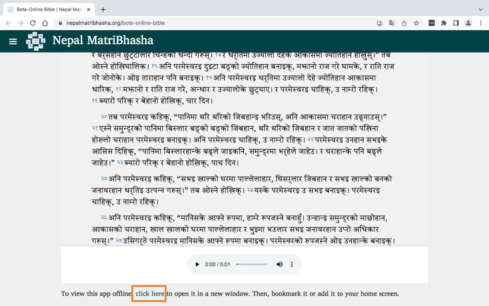 ๐ Scroll down to "To view this app offline, click here". Click on the link and you'll be redirected to Bible Web App.